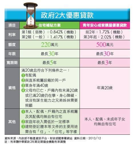 【政府2大優惠貸款】 「青年安心成家購屋優惠貸款」和「住宅補貼方案」可搭配使用,民眾只要同時符合兩方案的資格限制,即可重複申請,最高可申貸到720萬元的額度,貸款年限最長30年。